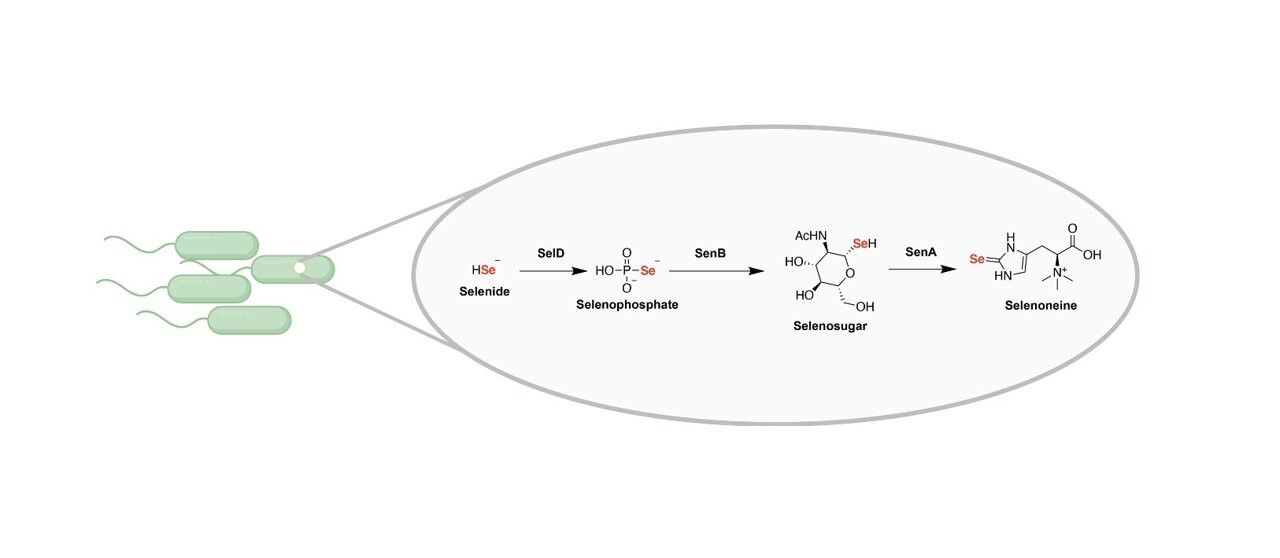 硒是多種生物必需的微量元素。已知有兩種途徑可將其插入蛋白質和核酸,分別是通過硒半胱氨酸和2-硒尿啶。然而,盡管硒的重要性,具體結合到小分子的途徑仍然是未知的。在這里,我們使用基因組挖掘策略,在各種微生物中發現了一個廣泛的三基因集群,編碼產生硒氨酸的途徑,硒氨酸是多功能分子麥角硫氨酸的硒類似物。我們闡明了所有三種蛋白質的反應,并發現了兩種新的硒碳鍵形成酶和生產硒糖的生物合成途徑,這是一個意想不到的中間產物到終產品。我們的發現擴大了生物硒利用的范圍,表明硒代謝組比以前認為的更多樣化,并為發現其他含硒天然產物奠定了基礎。